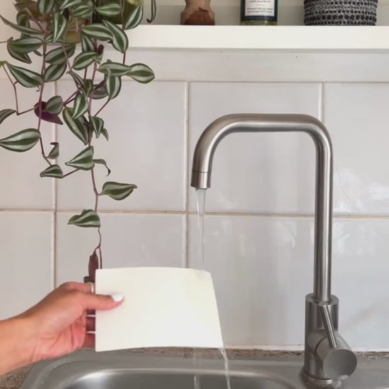 What starts out as a flat paper-like Sponge transforms into a 100% compostable cellulose sponge when run under the tap.