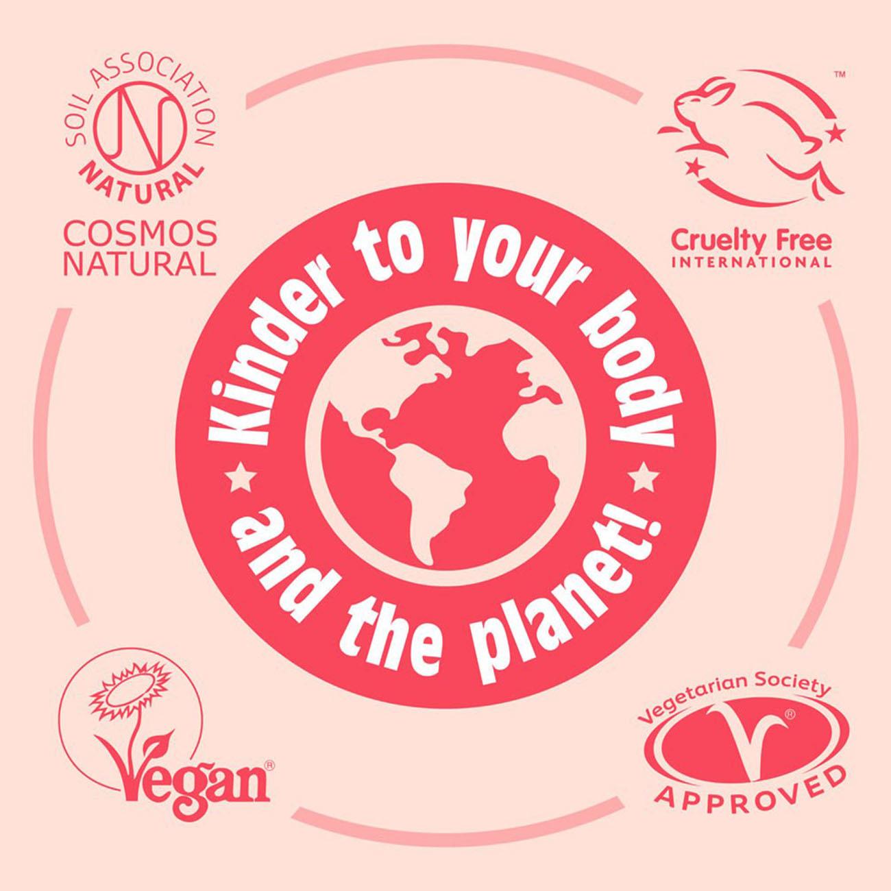 And we back it up with certifications, including COSMOS Natural, Vegan Society and Vegetarian Society, and Leaping Bunny.