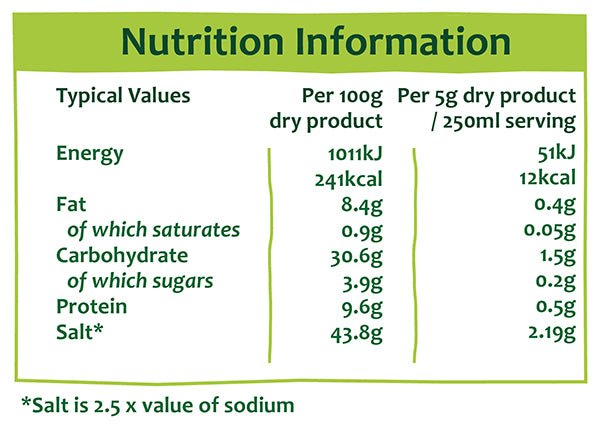 Ingredients: sea salt, hydrolysed vegetable protein (soya, maize), potato starch, palm oil (sustainable), vegetables 8% (parsnip, onion, leek, carrot), lactose (milk), parsley, celery seed, turmeric, white pepper, garlic, mace, lovage, nutmeg